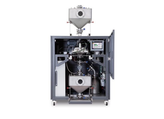 - powder handling up to ca. 8 kg/liter [500 lbs./ft3] bulk density and an impressive throughput