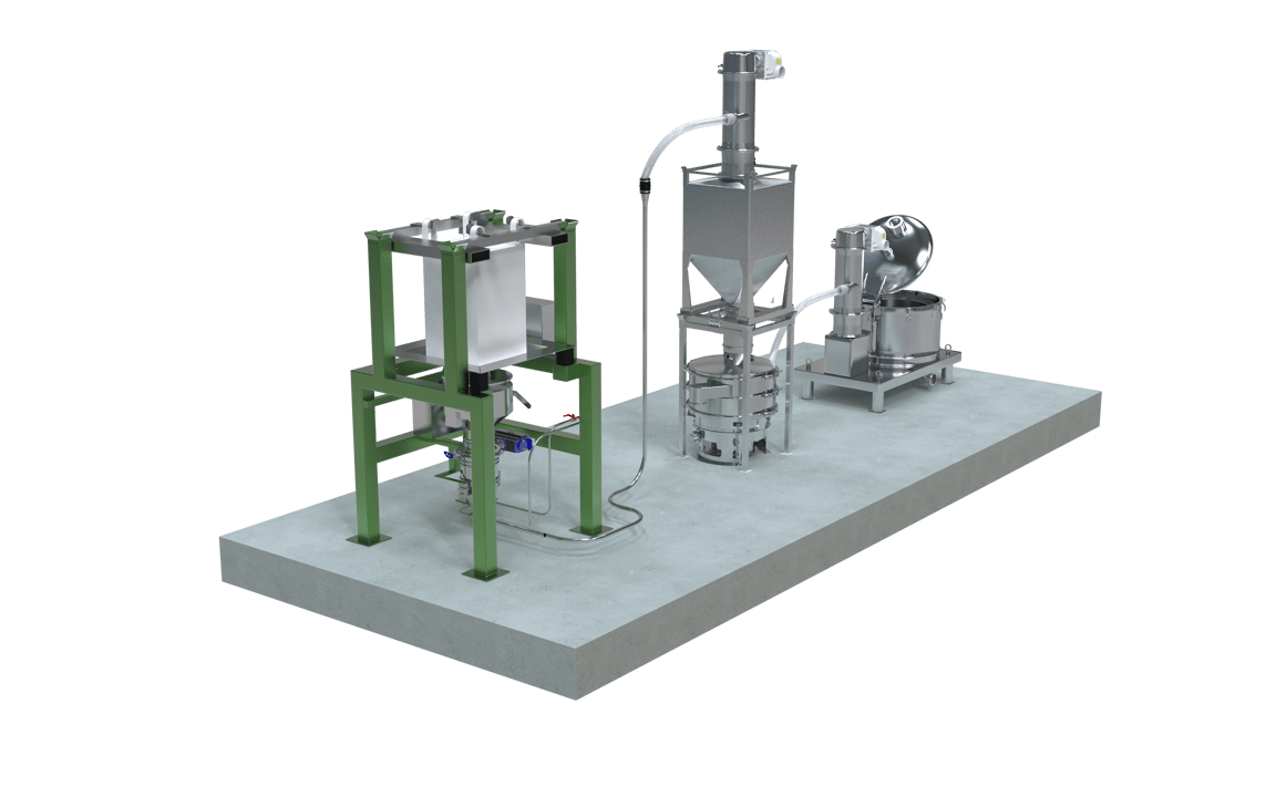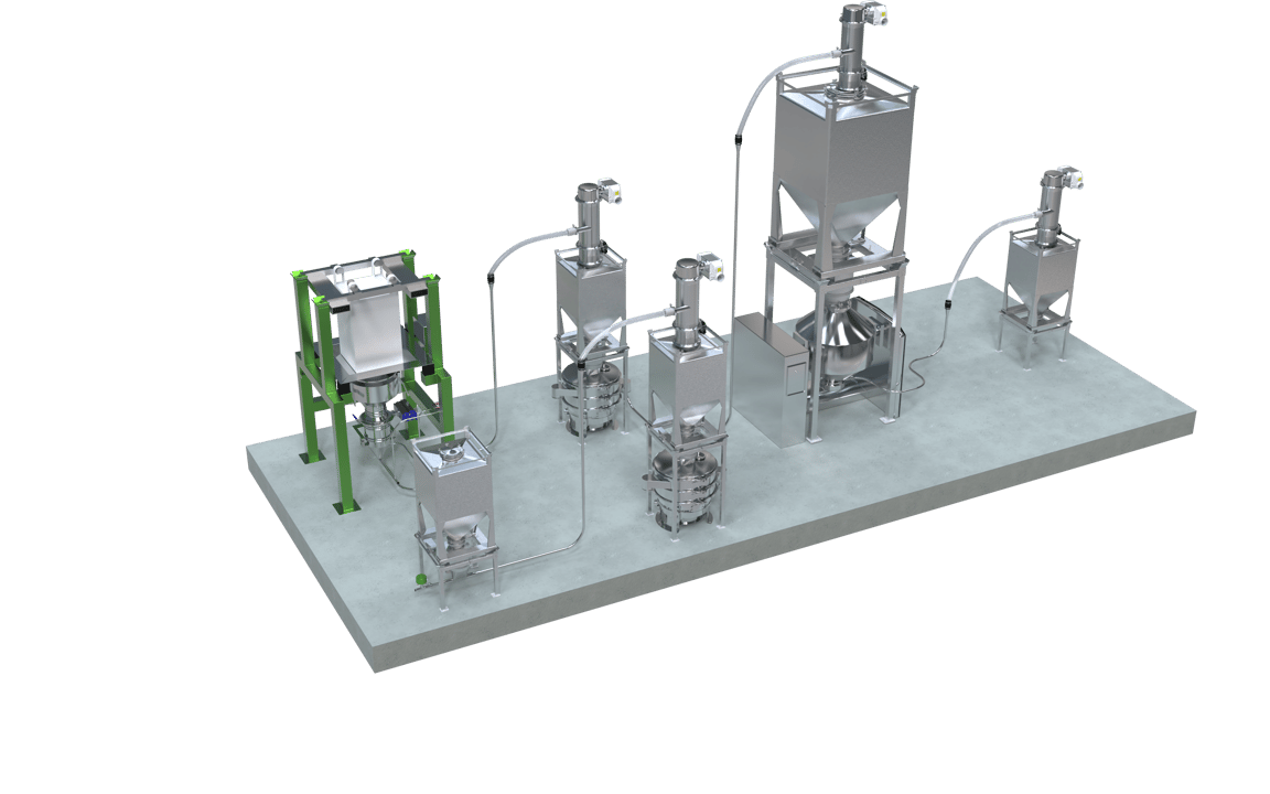 In this example, ingredients are picked up with a Piab vacuum conveyor from a big bag unloader, and from an IBC (intermediate bulk container). They are conveyed to a sieve and after screening conveyed through a diverter valve to a mixer, and finally into a hopper. In this setup, the material mix reaches its destination without the risk for product segregation. Solids can also be conveyed into a slurry mixer.