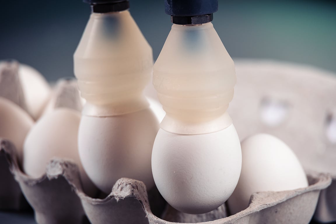 Piab’s stable egg suction cup enables safe, reliable grip for eggs, overcoming automation speed limitations. Its two step actuation ensures predictable picking and releasing, while stable bellows allow high accelerations. Operating at low vacuum saves energy, reduces egg white leakage, and minimizes cleaning needs, lowering machine downtime. The egg-cup is easy to clean and resistant to detergents and ultrasonic cleaning, ensuring long-term, efficient, and hygienic egg handling in automated processes.