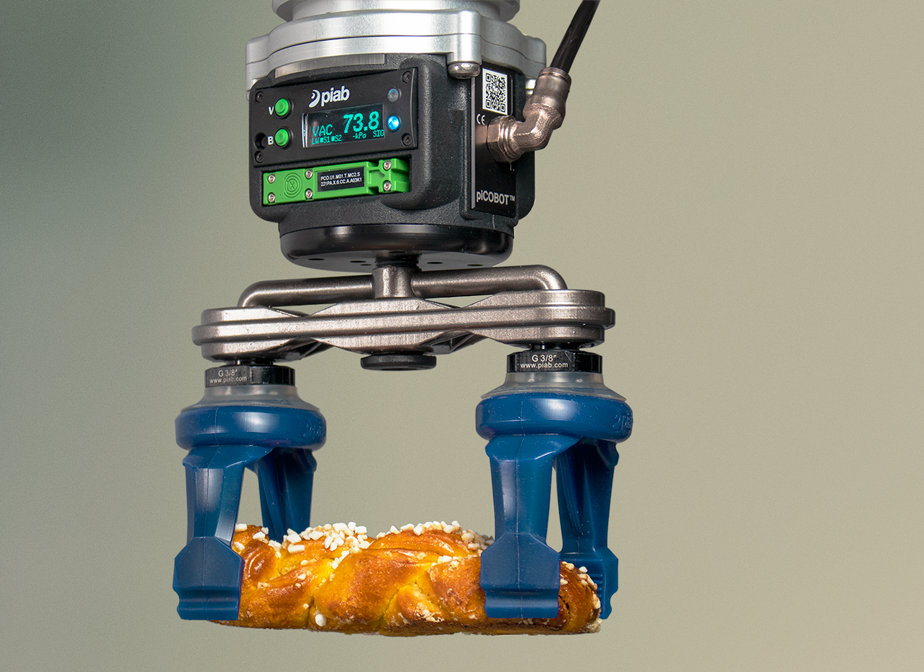 Due to the large variety of shapes, sizes and consistency of food products an adjustable vacuum level is required in order to avoid product marking or damage. Vacuum systems fitted with right type of suction cup and vacuum ejector are the most versatile and reliable solution for pick-and-place in the baking goods industry. Piab solutions ensure a high performing picking and placing operations.