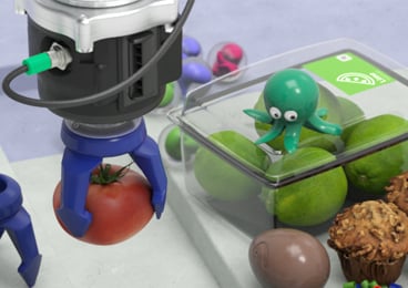 Połączenie narzędzi do przenoszenia, chwytania i podnoszenia firmy Piab umożliwia szybkie i bezpieczne pakowanie kruchych ciastek z truskawkami do transportu.